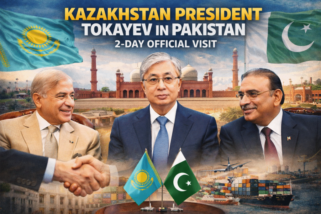 Kazakhstan President Kassym-Jomart Tokayev landed in Pakistan on Tuesday for a two-day official visit, signaling a new phase in Kazakhstan-Pakistan bilateral relations. The delegation’s arrival at Nur Khan Airbase was marked by a ceremonial welcome, reflecting the growing diplomatic and strategic partnership between the two nations.